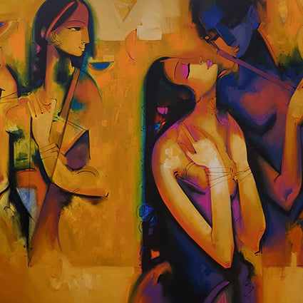 Arvinda Kolapkar is known for vibrant, joyful paintings that celebrate human connection. Often portraying couples and friendships, his work radiates warmth and emotional depth. Deeply inspired by classical and folk music, he frequently includes the flute—a symbol of Krishna and bliss. His art is a heartfelt tribute to love, unity, and shared joy.